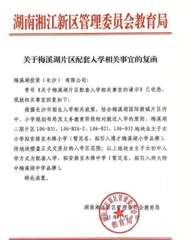 据另一份文件内容,梅溪湖二期片区L06-B31、L06-B26-2、L06-B21、L06-B32地块业主子女小学拟安排至木棉小学(暂定名,拟引入博才梅溪湖小学品牌),待地块楼盘正式交房后纳入学区范围;以上地块业主子女初中入学方式为配套入学,拟安排至木棉中学(暂定名,拟引入师大附中梅溪湖中学品牌)。